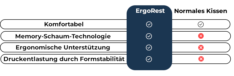 Viele wachen mit Nacken- oder Rückenschmerzen auf – oft wegen schlechter Kissen. Das ErgoRest Kissen wurde entwickelt, um genau das zu ändern: Es stützt Kopf und Wirbelsäule optimal und sorgt so für entspannteren, erholsameren Schlaf – Nacht für Nacht.